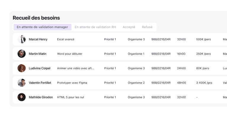 Visualisez l’ensemble des besoins en compétences de vos collaborateurs et faites une sélection pour votre plan prévisionnel de formation. Les demandes peuvent être réalisées par le salarié, le manager ou directement par les ressources humaines. Gagnez en flexibilité dans l’organisation de votre entreprise.