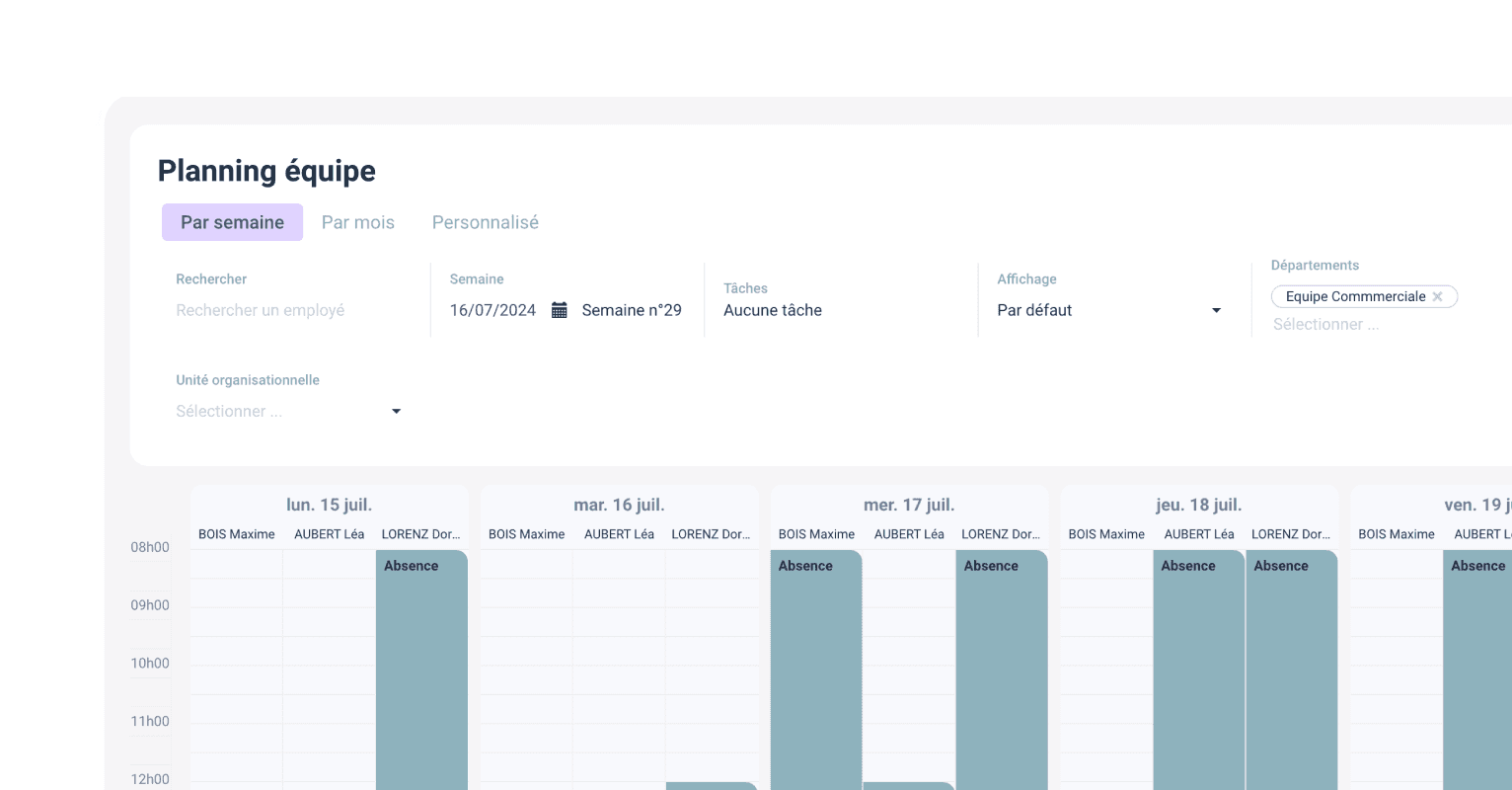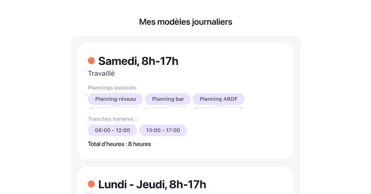 Le paramétrage des emplois du temps permet aux responsables RH de créer des plannings sur mesure, adaptés aux besoins spécifiques de chaque équipe, département, ou service. Les managers peuvent les définir par équipe, par tranche horaire, par code couleur, ou d'autres critères pertinents. En offrant une gestion optimale des ressources, vous augmentez la productivité et améliorez la flexibilité au sein de vitre entreprise.